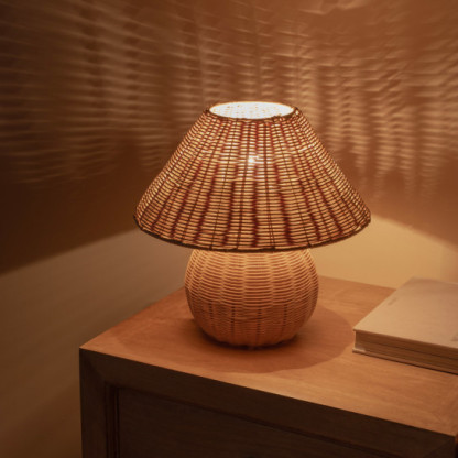 El diseño de las lámparas lo eliges tú: piezas rústicas, materiales naturales como el mimbre o incluso farolillos. Por si te inspira: esta lámpara de sobremesa con una composición única de ratán en acabado natural. Su textura rugosa evoca las formas de la naturaleza.