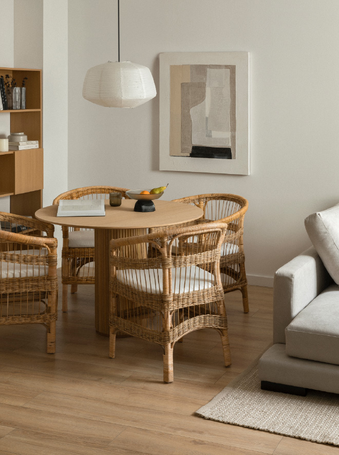 El mimbre y el ratán en color natural o blanco son imprescindibles. ¿Y qué tipo de muebles? Lo bueno es que tienes opciones para todos los gustos: mesas de madera, mesitas auxiliares, cómodas, sillones… Fíjate en esta butaca 100% de ratán. Queda genial tanto en interior como en terrazas o patios.