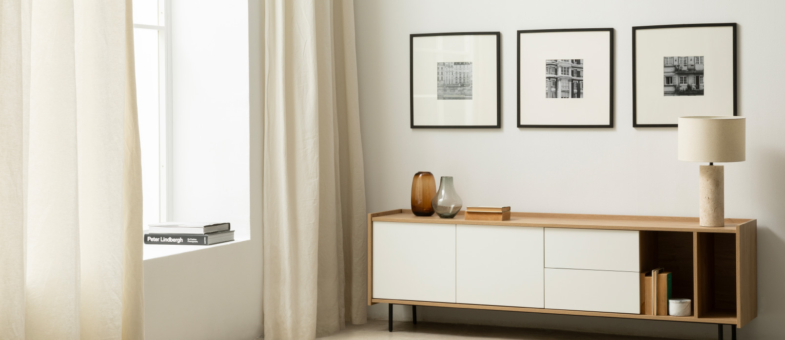 Para modernizar el gotelé, una gran idea puede ser colocar un aparador bajo y lleno de estilo. Este tipo de mueble no solo añade orden y funcionalidad a tu hogar, también equilibra visualmente la textura de la pared.