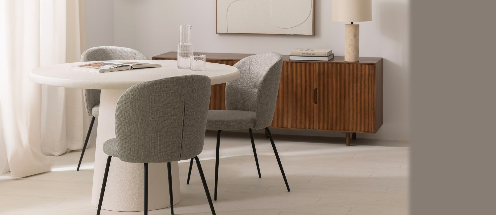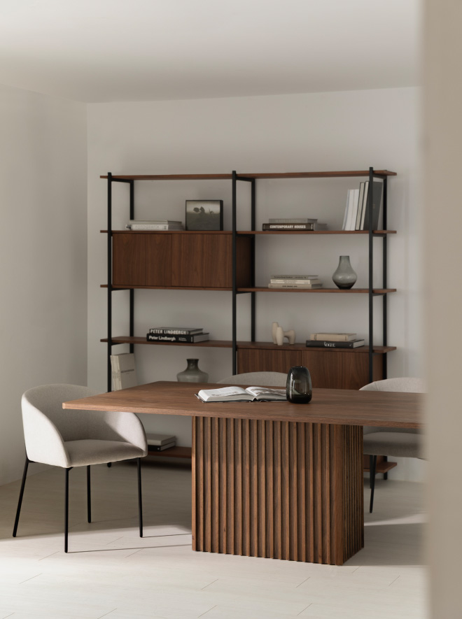 Un ejemplo: puedes optar por una base blanca neutra en tu salón (paredes, sofá o alfombra) y añadir contraste con piezas de madera oscura, como una cómoda, una estantería o una mesa.