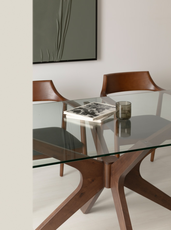 Echa un vistazo a esta mesa de comedor en acabado nogal y sobre de cristal, te va a encantar. ¿Un consejo? Combínala con sillas tapizadas en blanco, incluso un beige muy clarito, como estas sillas beige con patas negras. Perfecto para conseguir este contraste del que hablamos.
