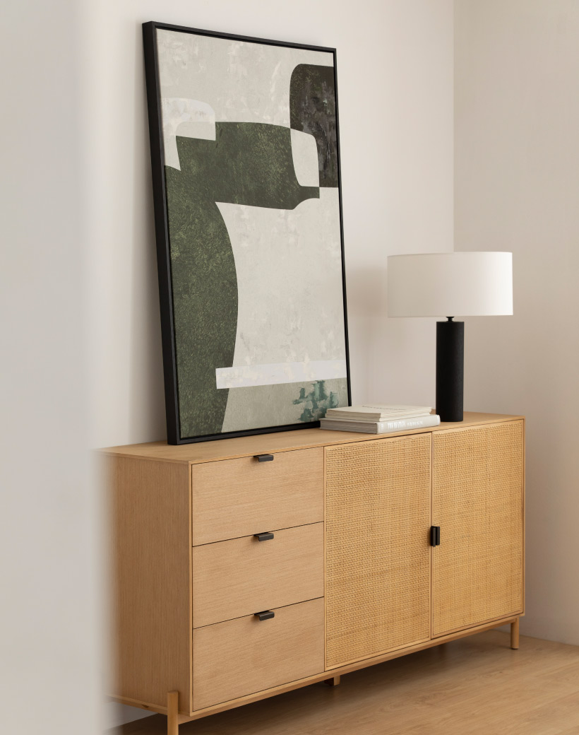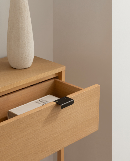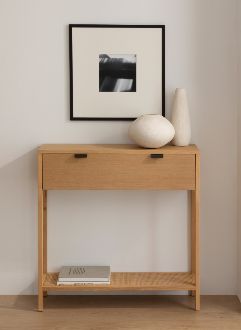 La serenidad de las formas sencillas. La consola Breda, más que ordenar, envuelve. Su cajón con detalles de ratán puede guardar pequeños objetos, pero su presencia transforma todo el ambiente.