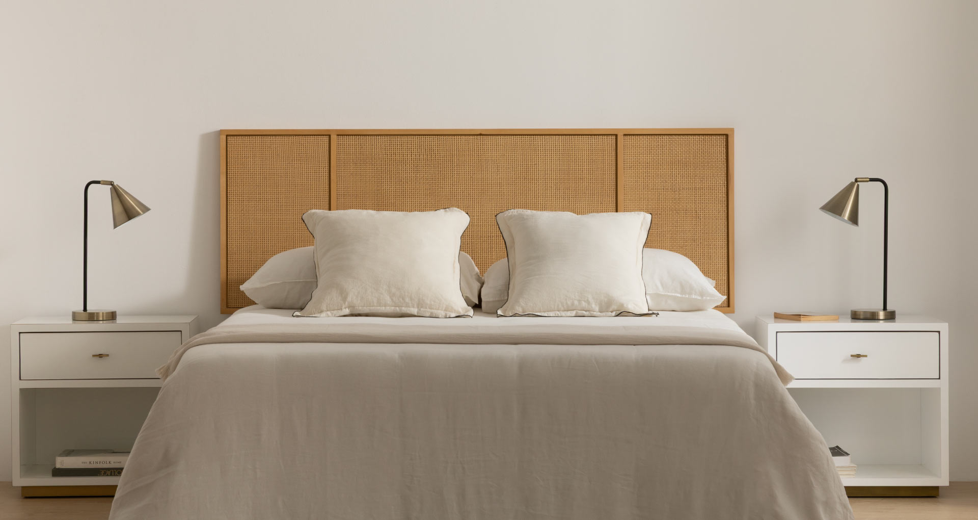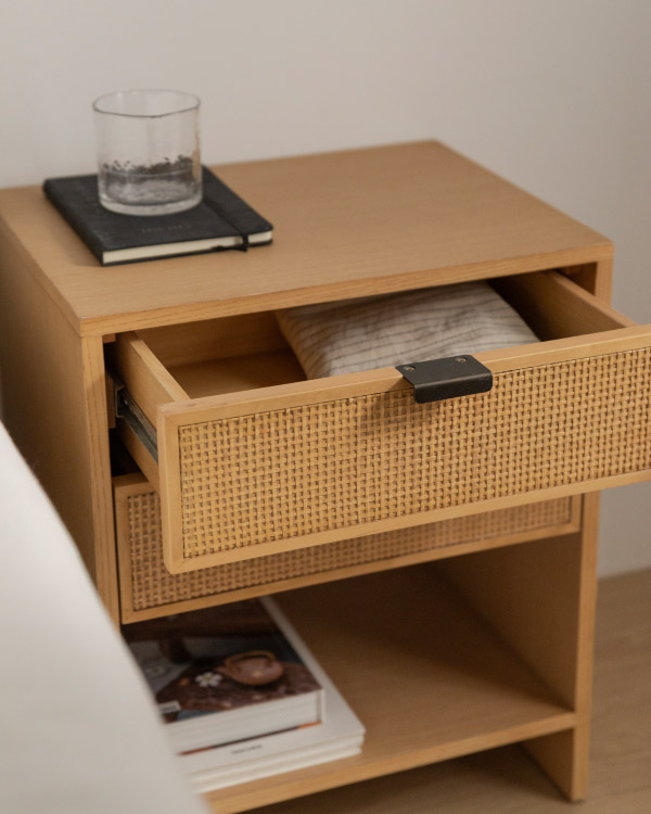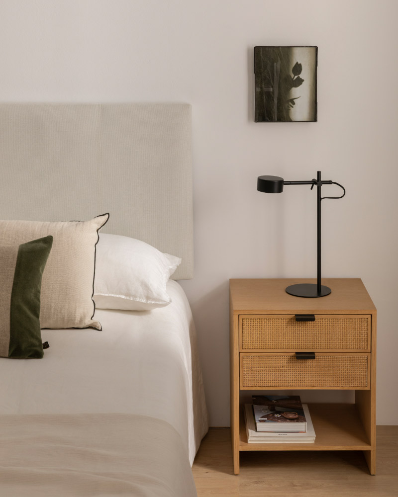 Muebles de madera natural y fibras como el ratán nos recuerdan que el descanso también se diseña. Calidez, equilibrio y ligereza como las mesitas de noche Breda. Materiales que conectan con la tierra para un dormitorio en calma.