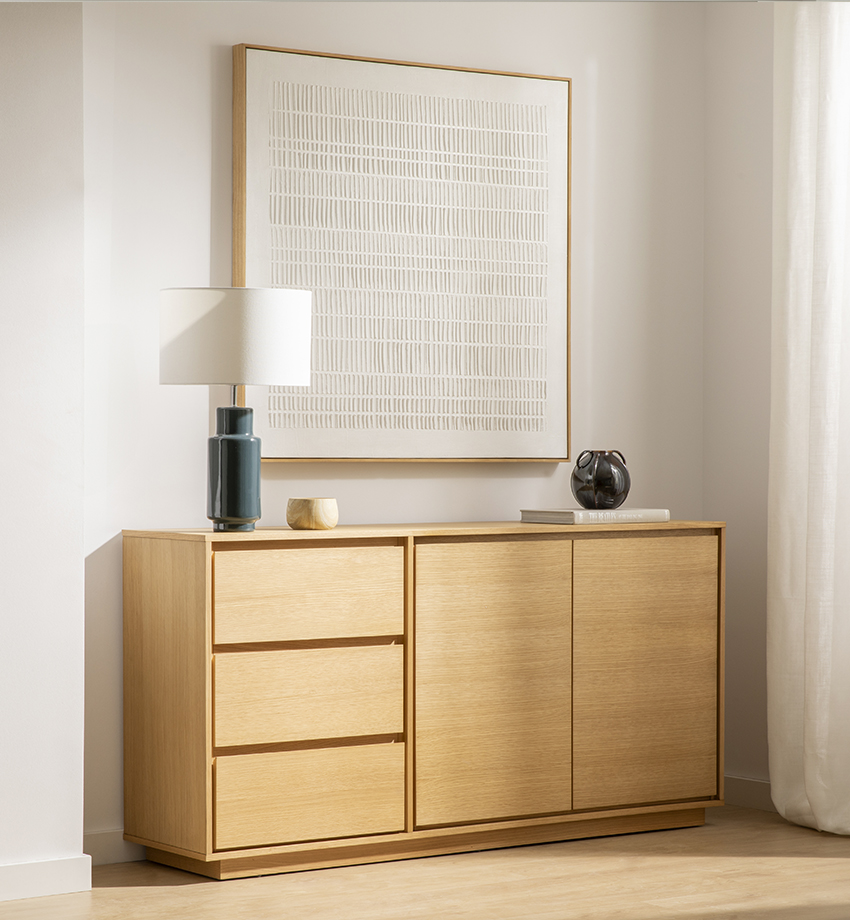 La colección Vinti aporta calidez y funcionalidad con acabados en chapa de roble o blanco y patas de madera maciza. Ideal para mantener el orden con estilo.