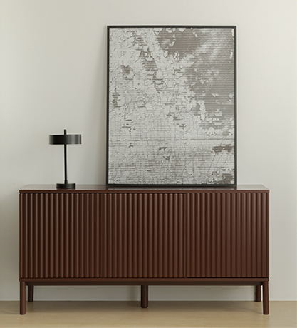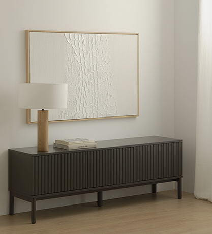 Destaca por su diseño alistonado en chapa de roble, que aporta textura y elegancia a través de relieves sutiles. Sus patas metálicas en negro contrastan con la calidez de la madera. Piezas sobrias y especiales que transforman cualquier estancia.