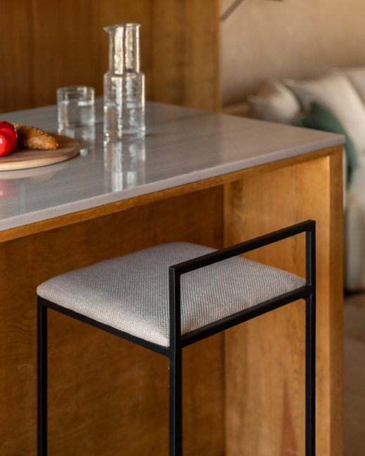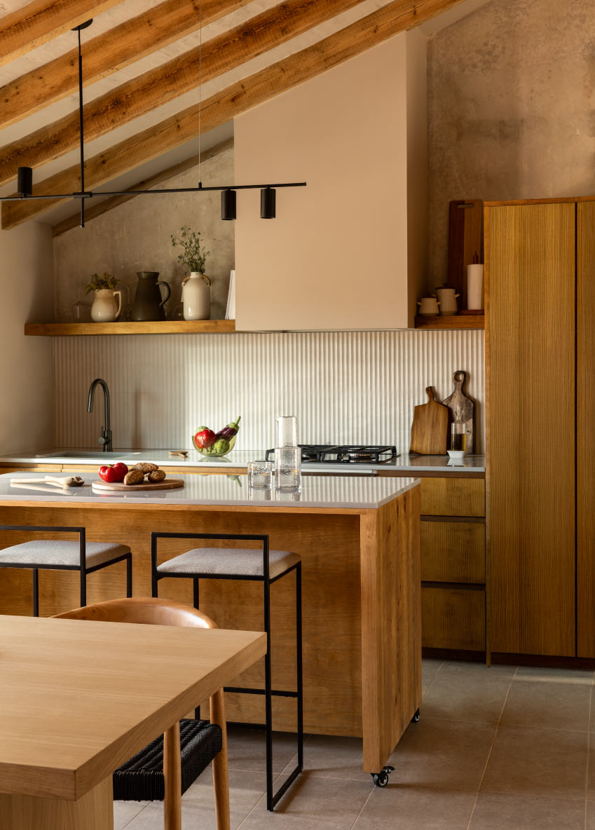 La casa de los abuelos ahora adaptada a la vida moderna, pero que exhibe con orgullo las huellas de su larga historia. En la cocina, las antiguas vigas de madera conviven con mobiliario de diseño minimalista como el taburete Stan, que conecta lo vintage con lo moderno.