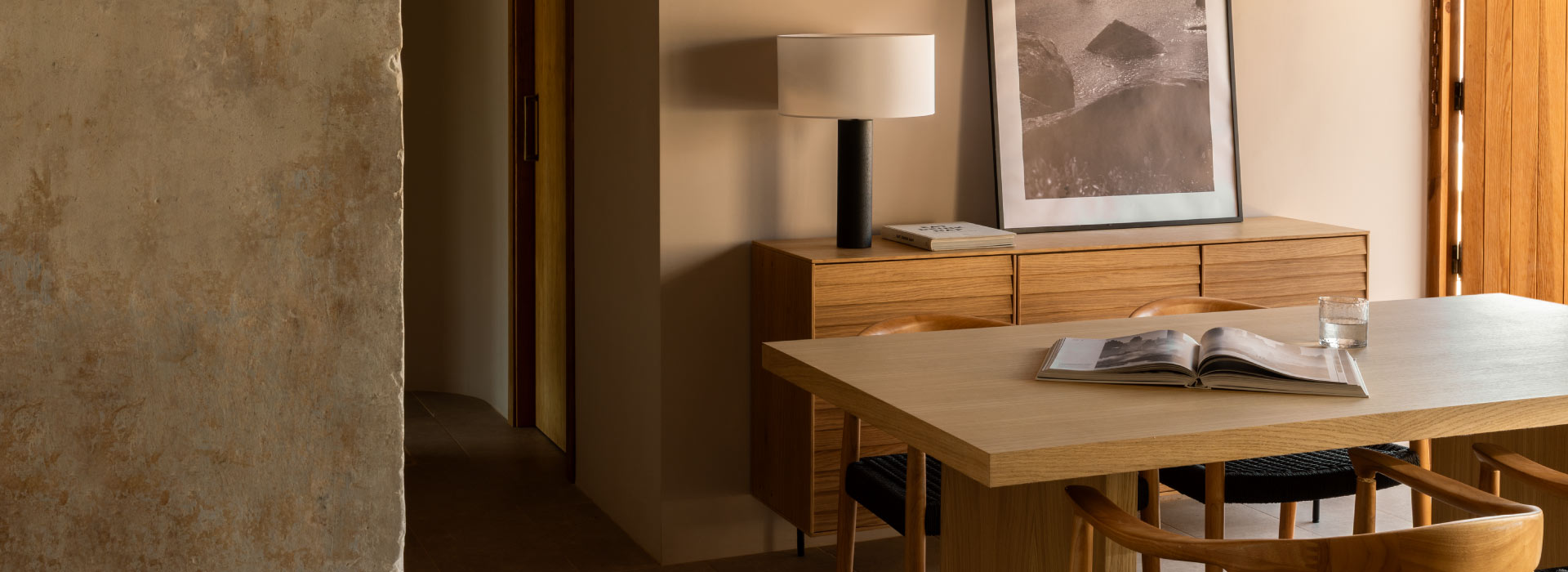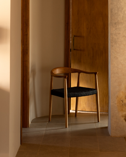 Madera, cuerda… materiales naturales han sido la opción elegida para el comedor. Es tiempo de sentarse en la silla Nang y mirar cómo la luz se filtra por las cortinas. Materiales que conectan con las raíces.