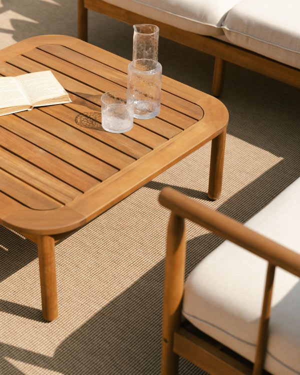 En el salón, elegimos dos piezas como protagonistas, con un diseño acogedor y contemporáneo. Un cómodo sofá cama para las noches cálidas de verano viendo los concursos de la tele. Y la mesa de centro Baltic, con un diseño orgánico y actual.