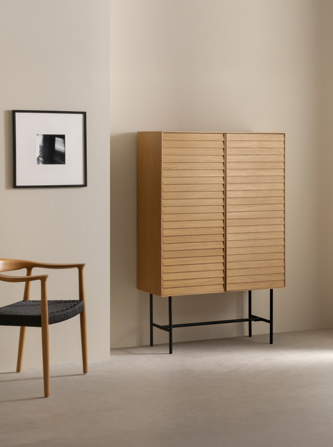 El recibidor puede ayudarte a cumplir con esta misión, sobre todo si aprovechas la altura con un mueble como este aparador alto de chapa de roble. Cuenta con estantes interiores extraíbles, con gran capacidad de almacenamiento.