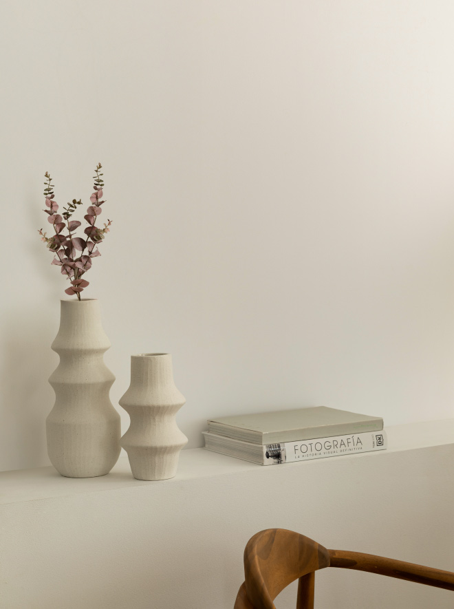 3.Usa macetas neutras o de cerámica blanca para conseguir un efecto más amplio y limpio. También puedes colocar tus plantas artificiales sobre este centro decorativo fabricado en cemento blanco. Vas a alucinar con el efecto.