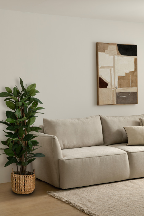 Colocar una planta artificial junto al sofá es una buena idea para completar el look de tu salón sin recargarlo. No nos podemos resistir a esta composición: un precioso bananero de hoja verde artificial.