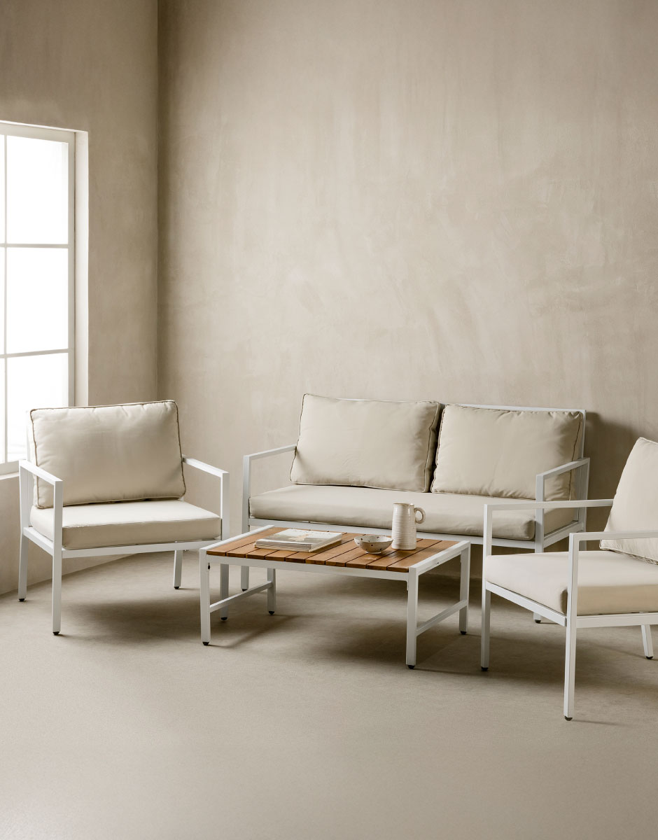 La venta de muebles usados es una forma de dar vida a espacios únicos, como el jardín, donde todo invita a la calma. Naturalidad y carácter, como los de este set de exterior Valner compuesto por un sofá doble con dos sillones individuales y una mesita auxiliar.