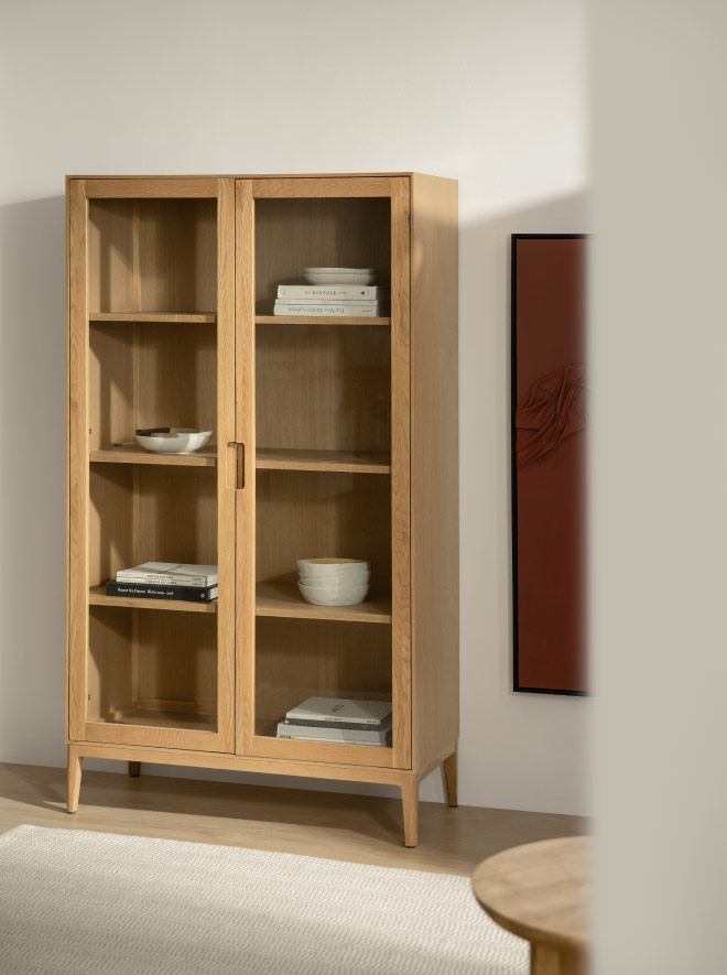Para muestra, esta preciosa vitrina con tonos naturales y puertas de cristal, en chapa de roble y patas de madera maciza.