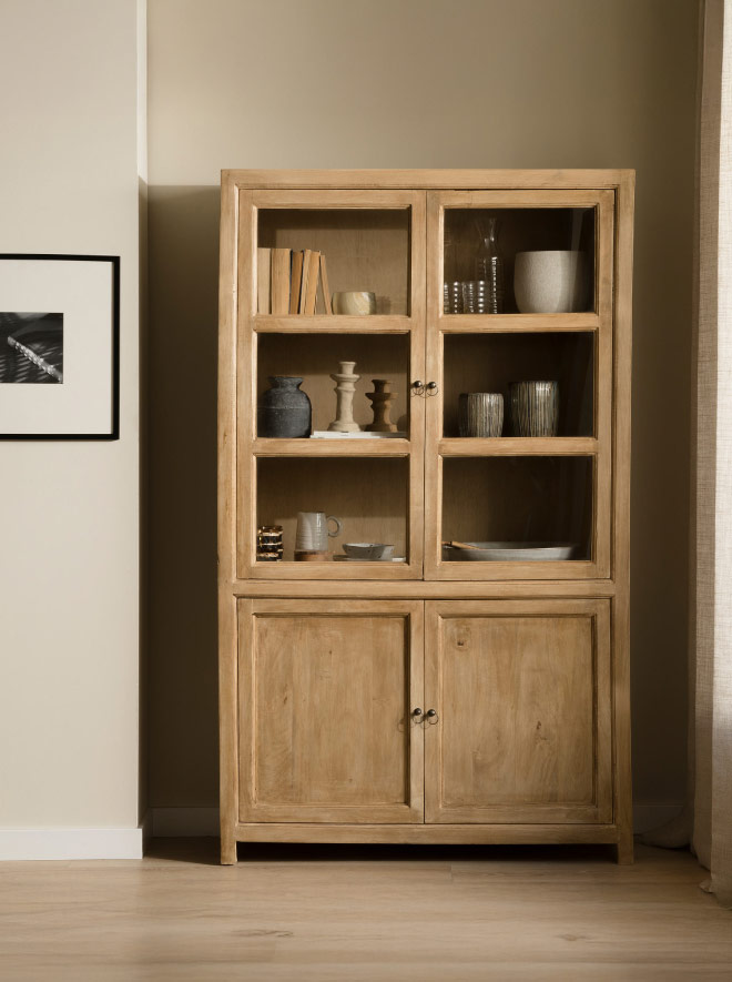 Por ejemplo, esta vitrina natural de madera maciza tiene un acabado que combina en cualquier tipo de ambientes. Su interior con amplias baldas es ideal para colocar la vajilla, libros, o elementos decorativos en tonos neutros, como esta vela de cerámica de color beige y líneas dibujadas sobre su superficie.