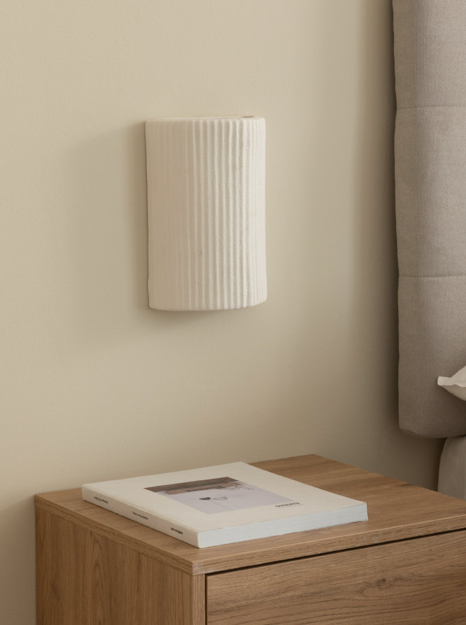 Semi esfera escultórica: proporciona una luz ambiental y suave, creando una atmósfera tranquila. Estos apliques son ideales para instalar en salones minimalistas cálidos y disfrutar de su diseño sencillo y acogedor, como es el caso de este aplique de cerámica de formas redondeadas.