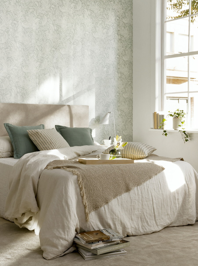 Un diseño de papel pintado a base de cuadrados en color verde clarito, por ejemplo, da ese plus de calma ideal para crear un clima de descanso.