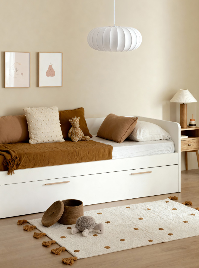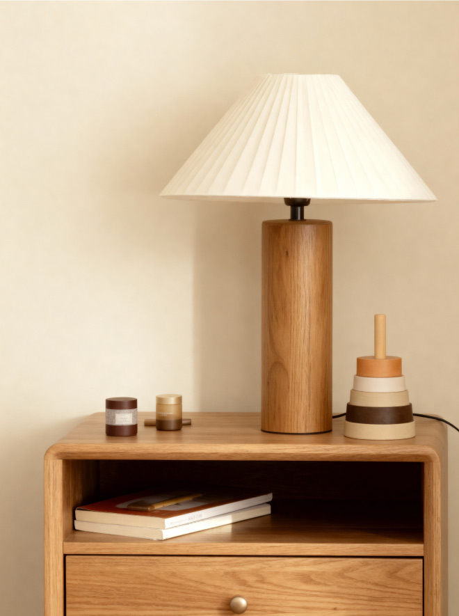 Un acierto seguro es utilizar una lámpara de sobremesa de materiales naturales y colores neutros. De esta forma se aporta una sensación de calma y bienestar que crea un ambiente relajado, ideal para los momentos con tu bebé.