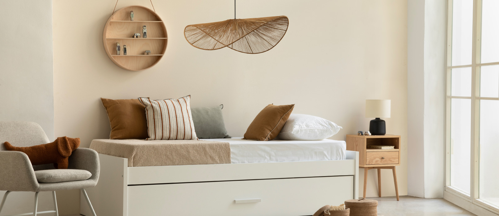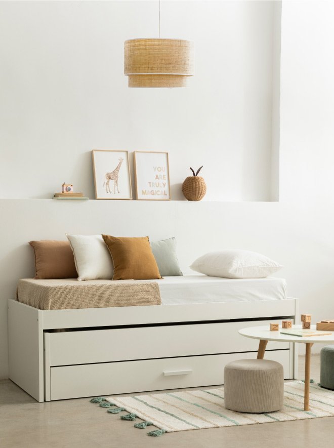 Una bonita lámpara de techo con pantalla doble de rafia natural con ribete en blanco será perfecta para aportar un toque de calidez y estilo al cuarto de tu bebé.