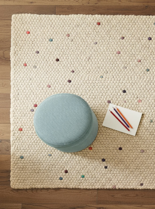 En las habitaciones aesthetic los tejidos tienen que ser agradables tanto al tacto como a la vista. Es un estilo que adora las mullidas alfombras de algodón. Este modelo, con franjas de líneas negras, propone un diseño sencillo que aumentará el confort de la estancia sin recargarla visualmente.