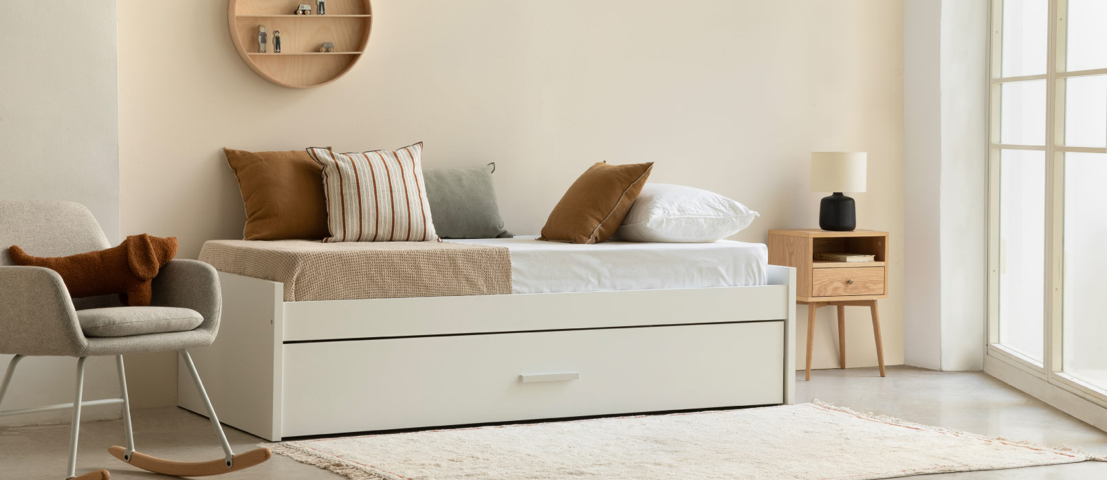 Cuando vienen los amigos a dormir, el dormitorio necesita más que nunca seguir siendo un espacio multifuncional y organizado. Nos encantan las camas nido, como ya te contamos en nuestro post sobre cómo poner dos camas en una habitación pequeña.